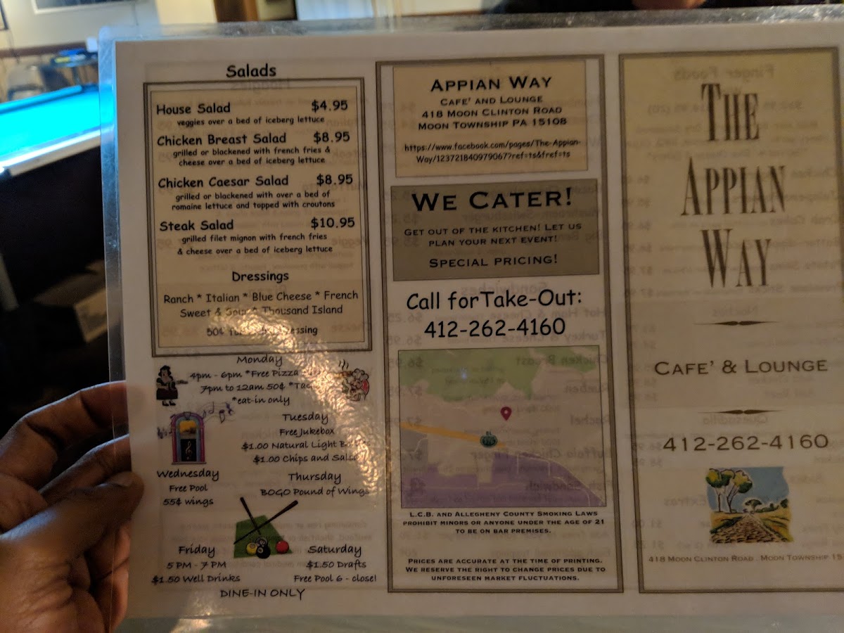 If you're looking for a place that offers a cozy vibe with great food and drinks, look no further than the Appian Way Cafe & Lounge Menu. Located at 418 Moon Clinton Rd in Moon Township, PA, this spot is the perfect combination of casual and contemporary. Whether you're in the mood for a hearty breakfast, a delicious lunch, or an evening bite, their menu has something for everyone. With everything from freshly prepared sandwiches to mouth-watering entrees and refreshing beverages, there's no shortage of options to satisfy your cravings. It's easy to see why this place is a local favorite - the food is consistently tasty, and the atmosphere invites you to relax and enjoy. Whether you're stopping by for a quick bite or planning to hang out with friends, Appian Way is sure to offer an unforgettable experience every time.
